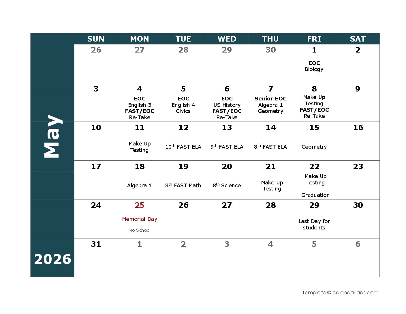 May Testing Calendar